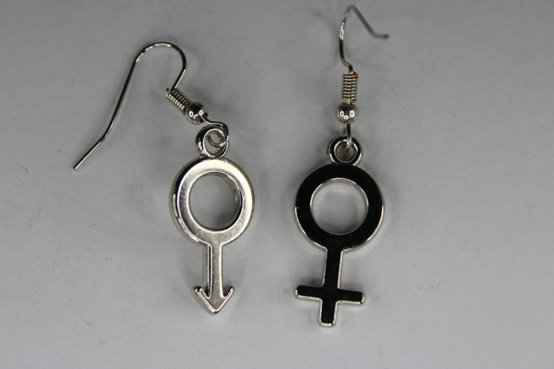 Leuke oorbellen met als hanger zowel het mannelijke als het vrouwelijke seksesymbool