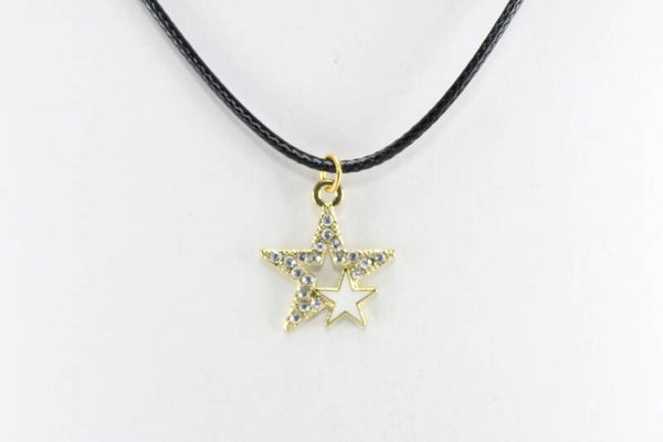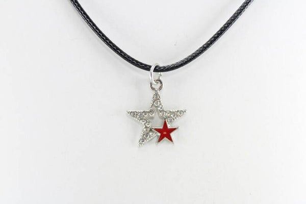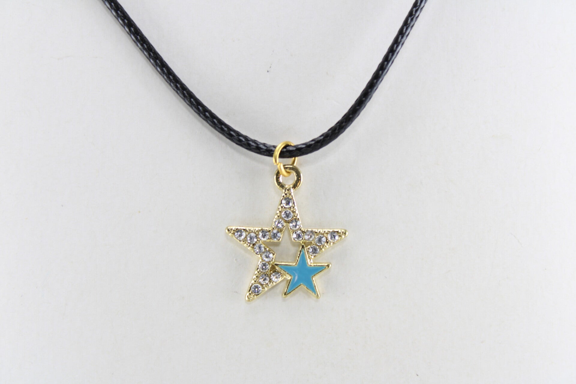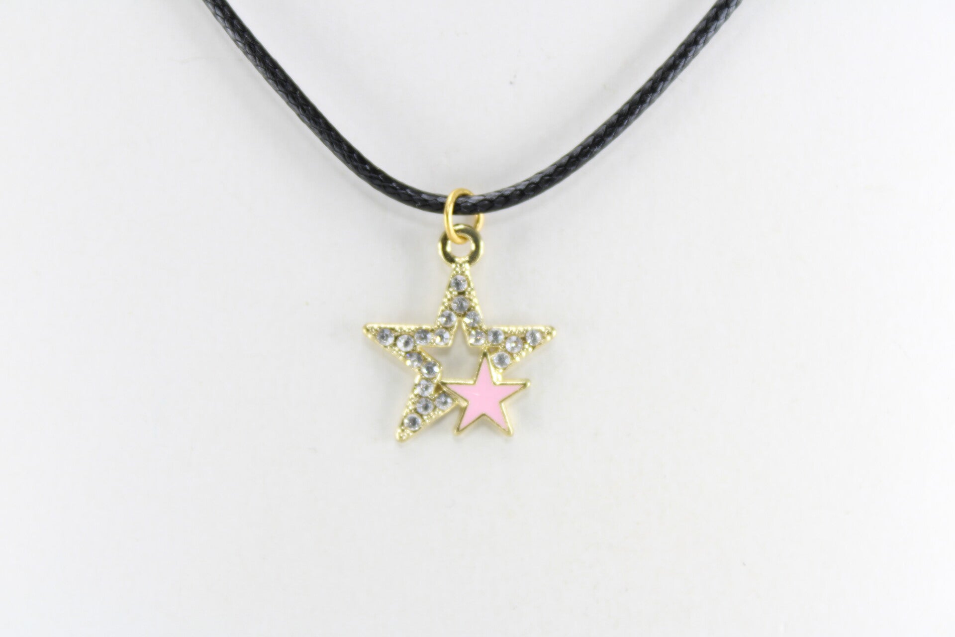 Een zilverkleurige ster met extra accent een gekleurde ster in de grotere, hangend aan een koord met sluiting