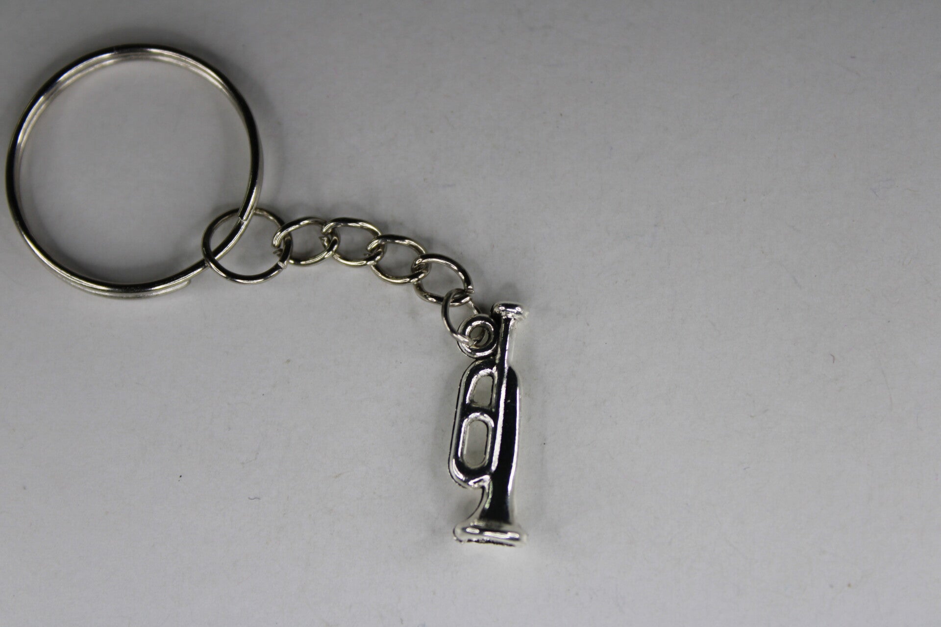 Mooie sleutelhanger met als hanger een zilverkleurige trompetje