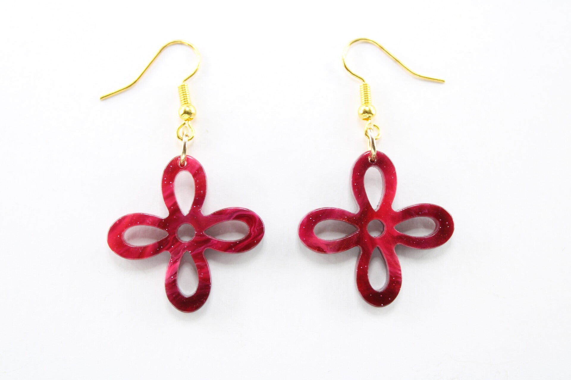 Rode oorbellen met een opgewerkt bloem- of klavermotief