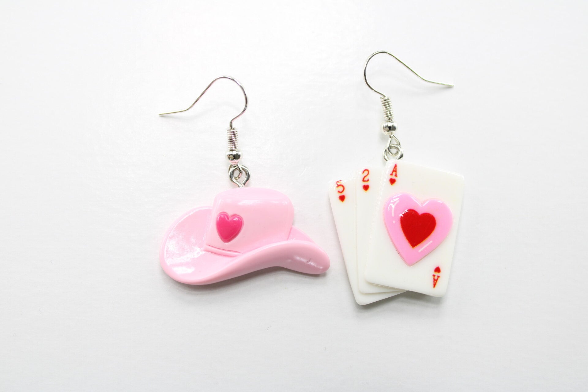 Leuke oorbellen met aan 1 kan kant een cowboyhoed en aan de andere kant speelkaarten.