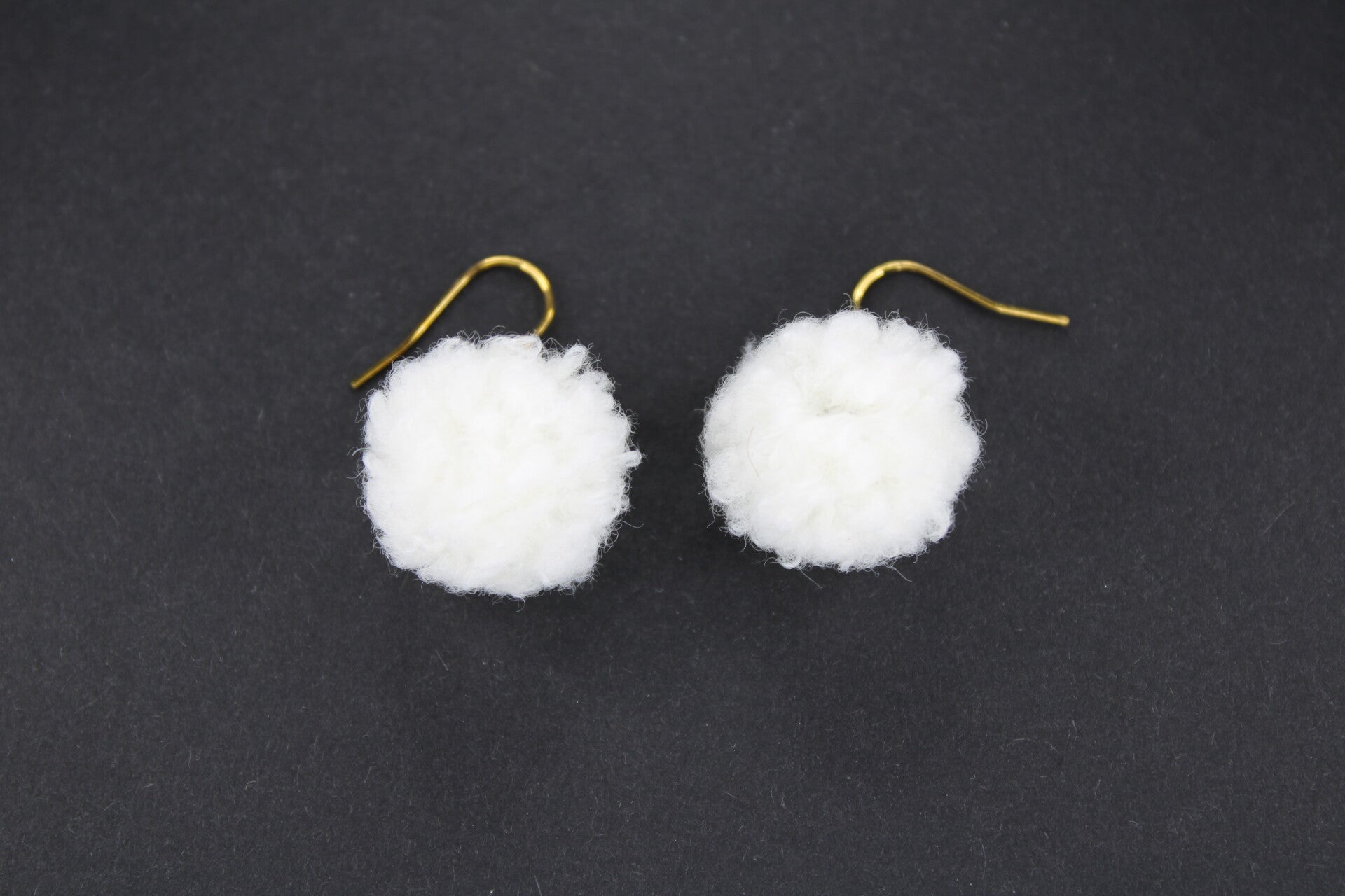 Leuke pompoms in een wollige uitvoering hangende aan een goudkleurige oorhaak
