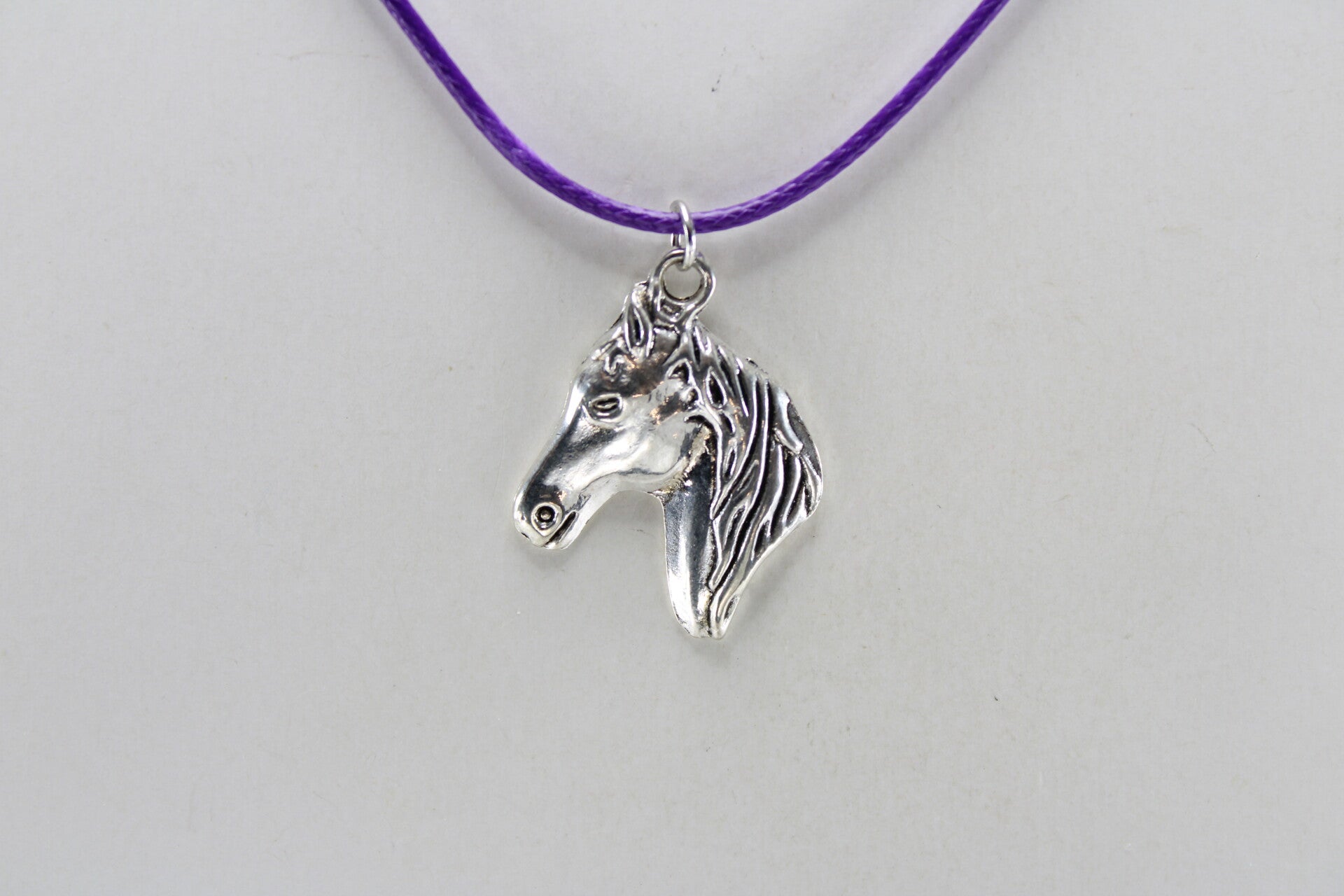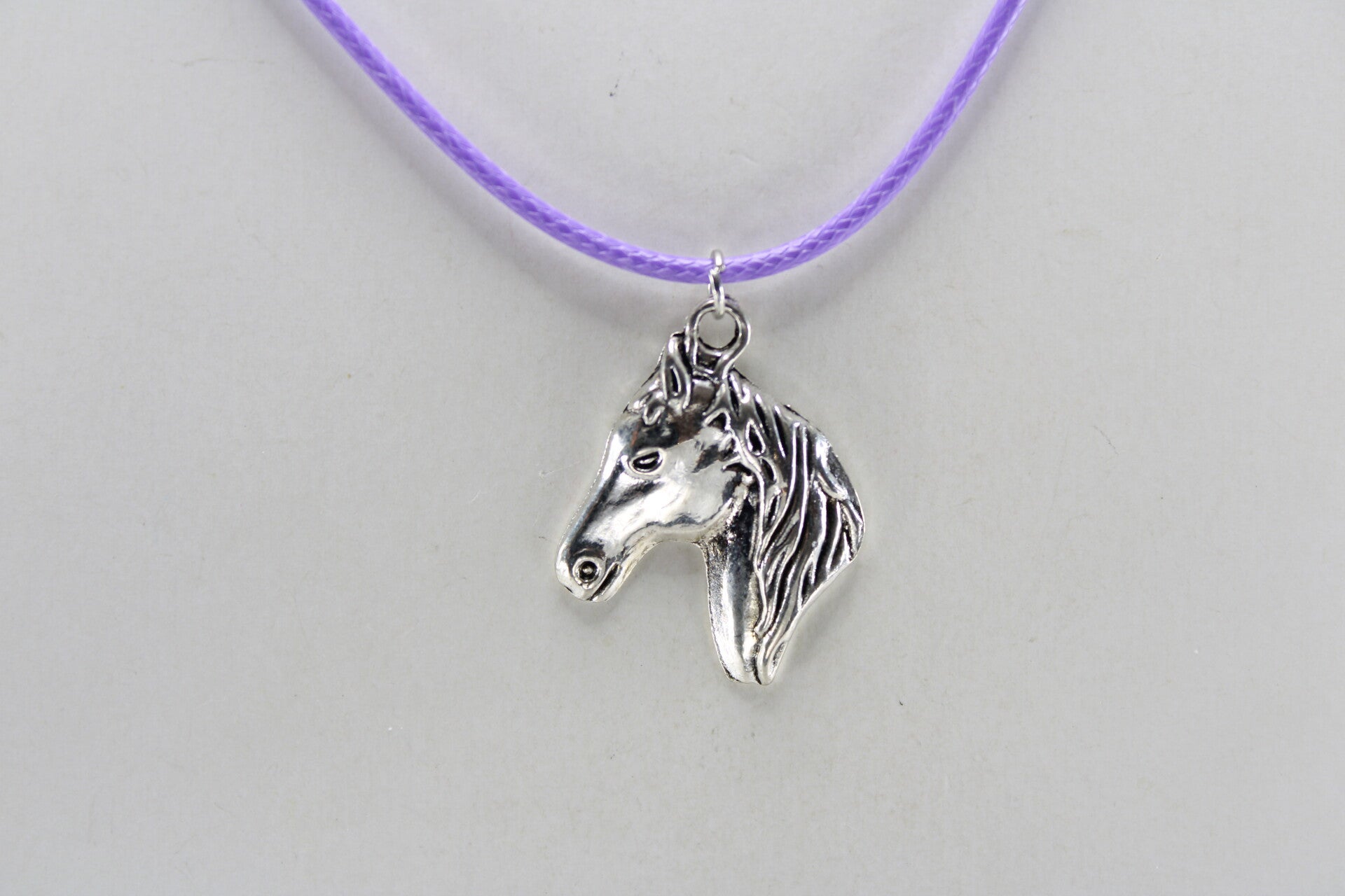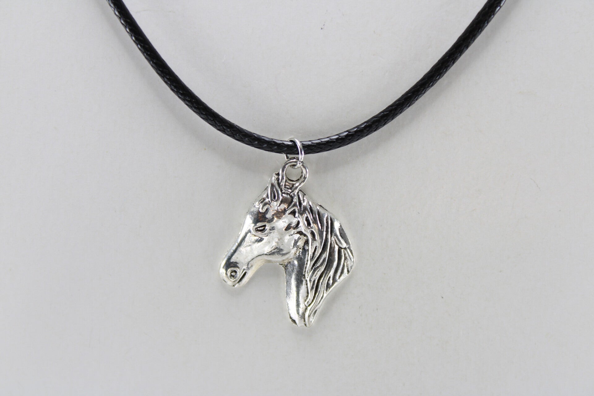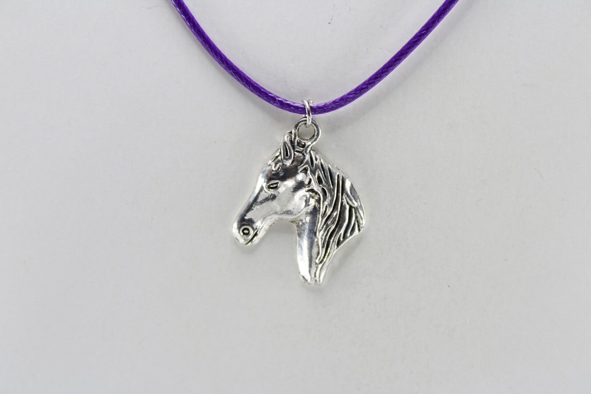Mooie vormgegeven paardenhoofd zilverkleurig hangend aan koord met sluiting in verschillende kleuren verkrijgbaar