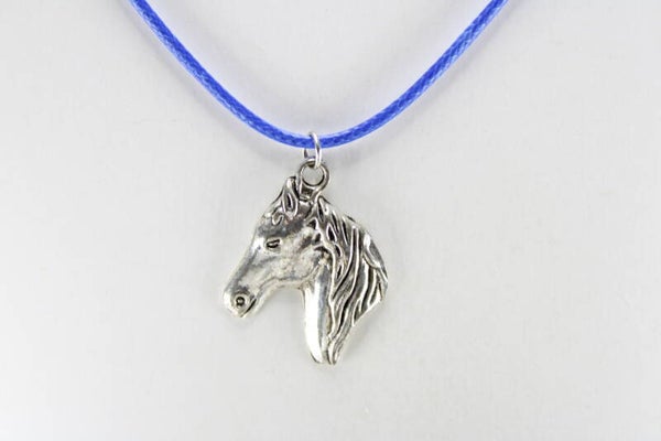 Mooie vormgegeven paardenhoofd zilverkleurig hangend aan koord met sluiting in verschillende kleuren verkrijgbaar