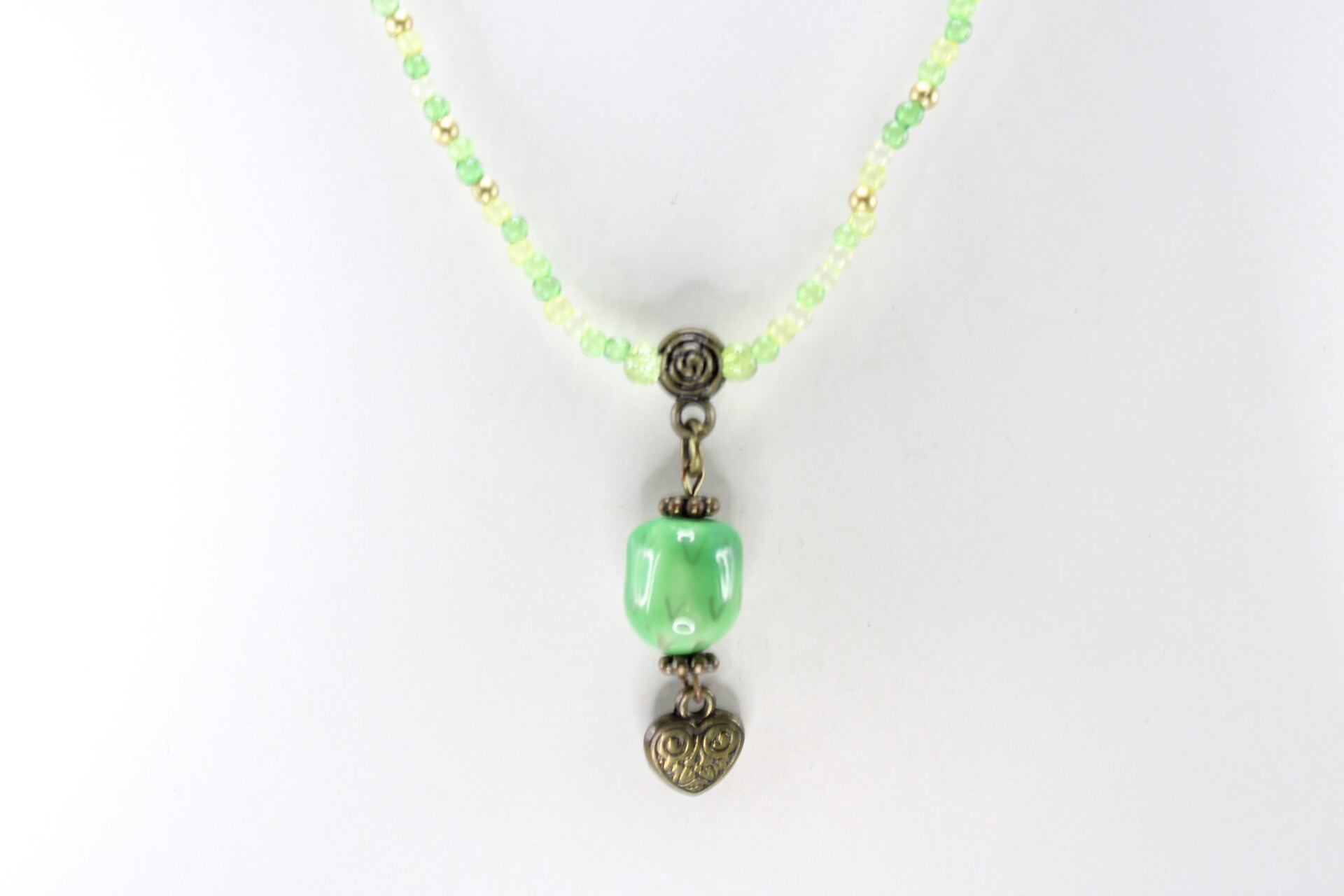 Een natuursteen met daaronder eeh hart vormen samen deze rustieke liefde een een meekleurende groene kralenketting met sluiting