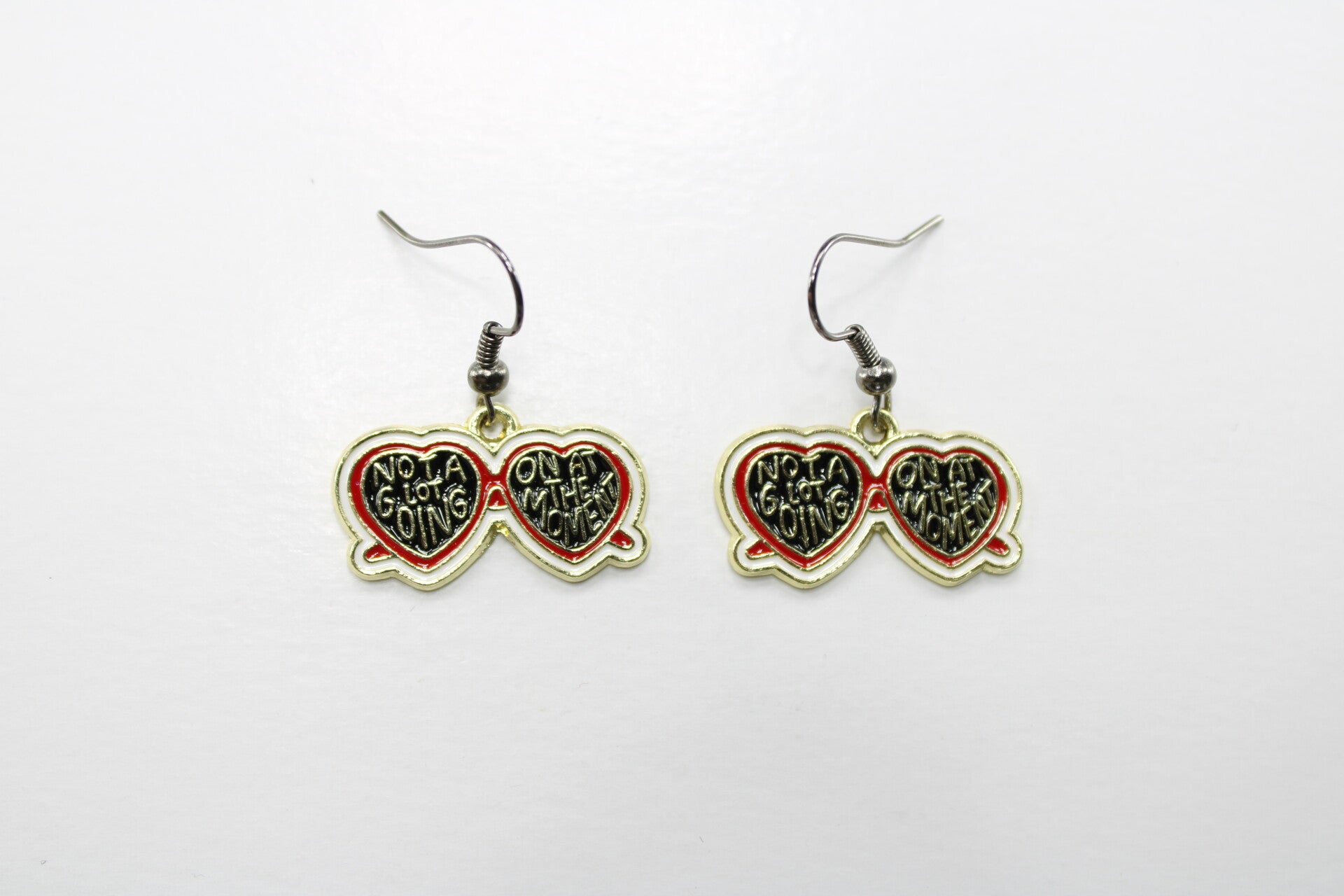Dubbele hartjes oorbel met de tekst: not a lot going on at the moment