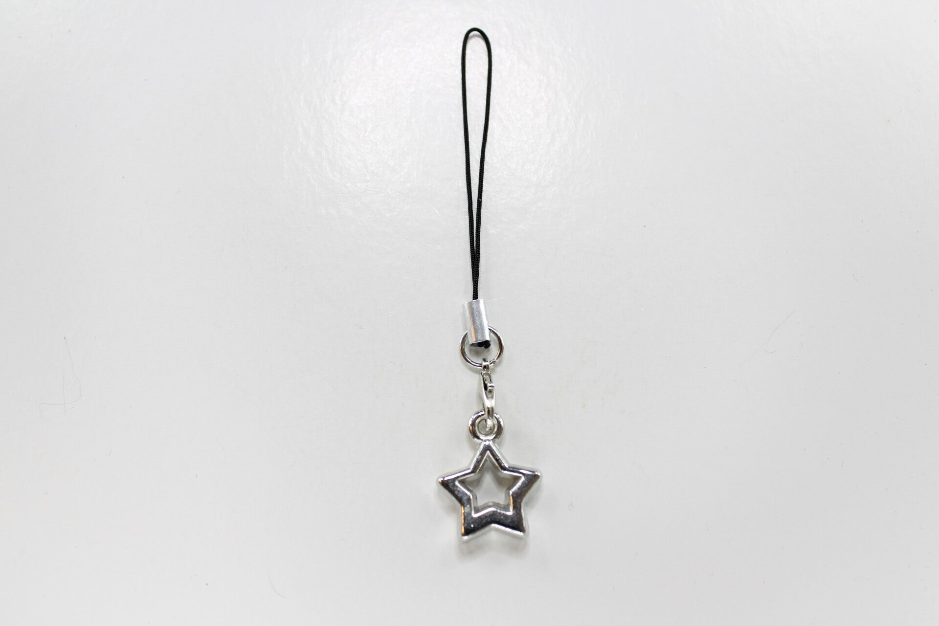 Zilverkleurige bedel in de vorm van een open ster te verkrijgen aan een wit of zwart koord