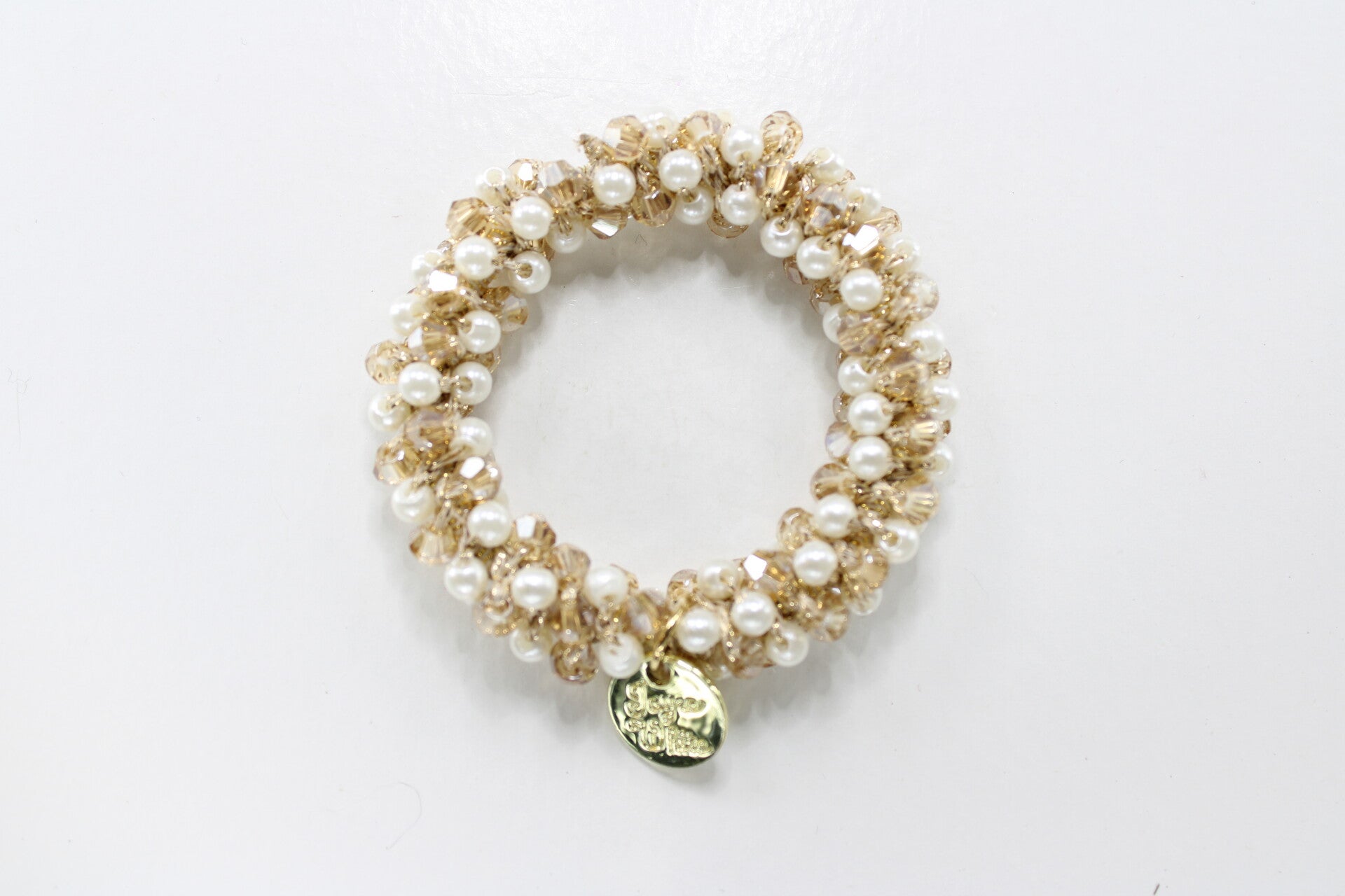 Een haarelastiek dat tevens als armband gedragen kan worden, bestaande uit kralen en goudkleurige elementen