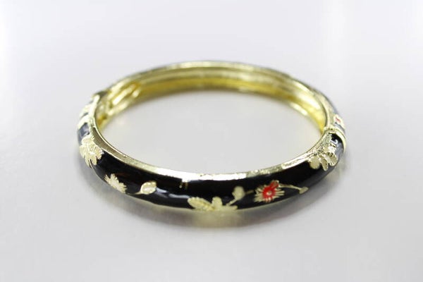 Met een scharnierende sluiting is deze armband gemakkelijk om de pols te bevestigen. Een emaille basis versierd met floraal motief van gouden bladeren en accenten