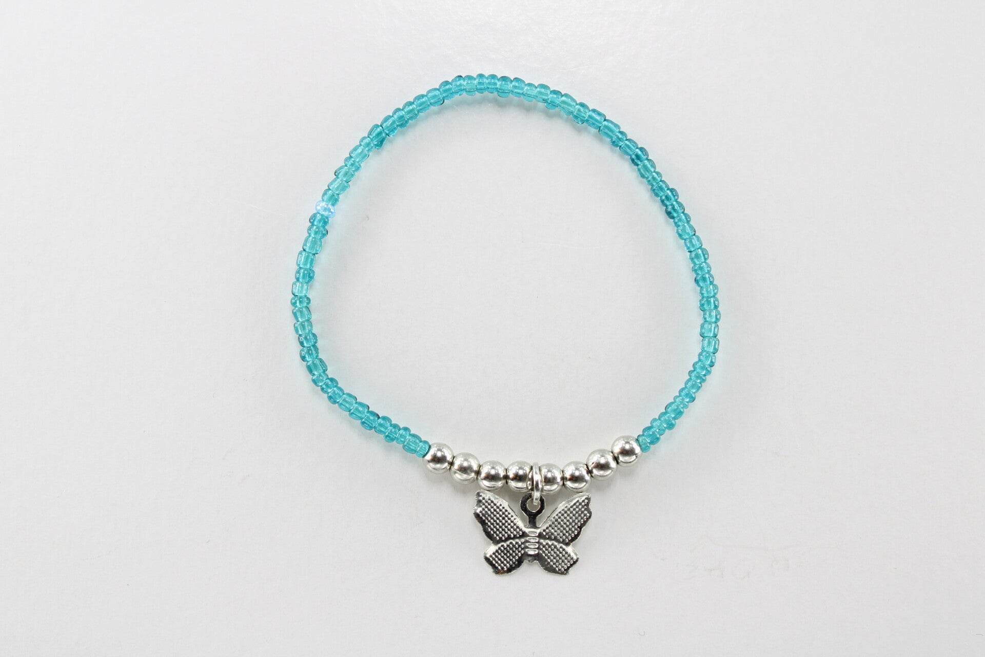 Deze armband met blauwe kralen heeft een mooie vlinderbedel