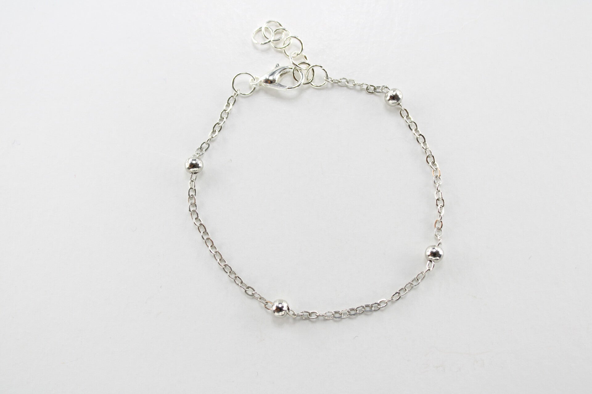 Een zilverkleurige schakelarmband met kleine ronde balletjes die op regelmatige afstanden in de ketting zijn verwerkt, en is voorzien van een karabijnsluiting