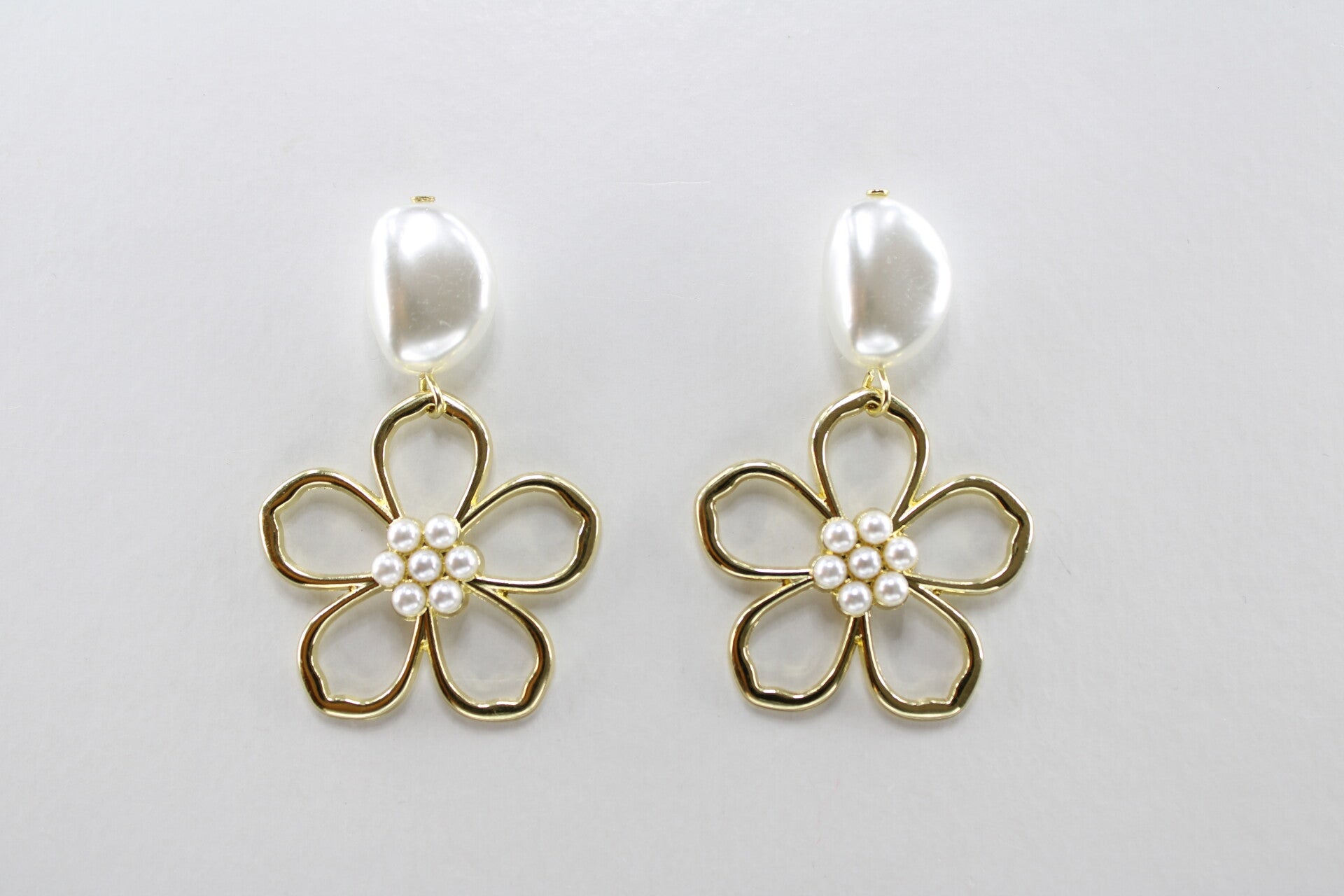 Een open bloem met pareltjes in het hart vormen deze mooie goudkleurige oorbellen