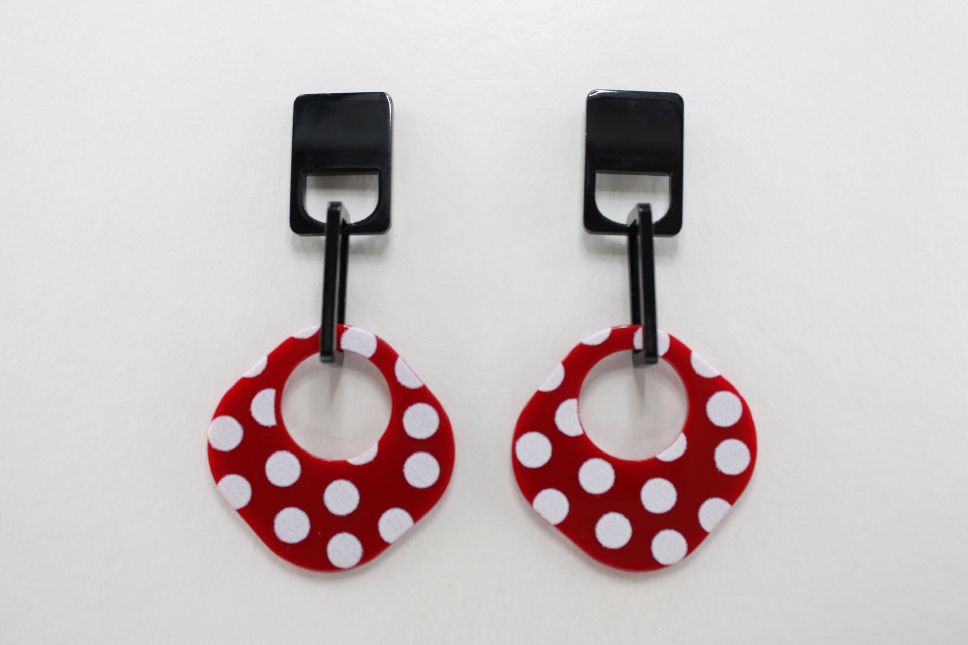 Deze retro, vintage steker oorbellen bestaan uit een zwart rechthoekig bovendeel met daaraan een ronde rode hanger met stippen.