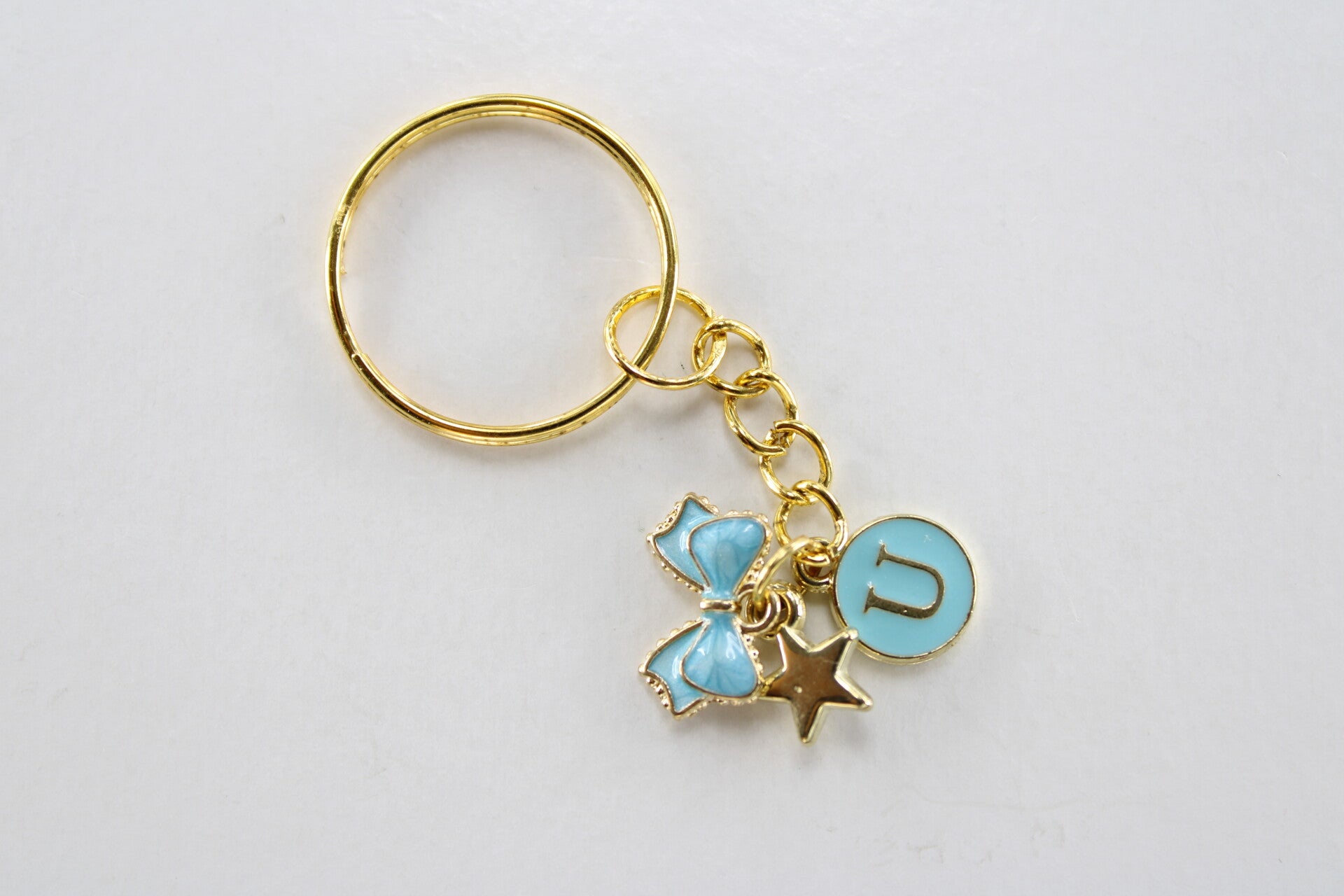 Aan deze sleutelhanger hangen verschillende bedeltjes, waaronder een blauwe strik, een kleine gouden ster en een ronde hanger met de letter U