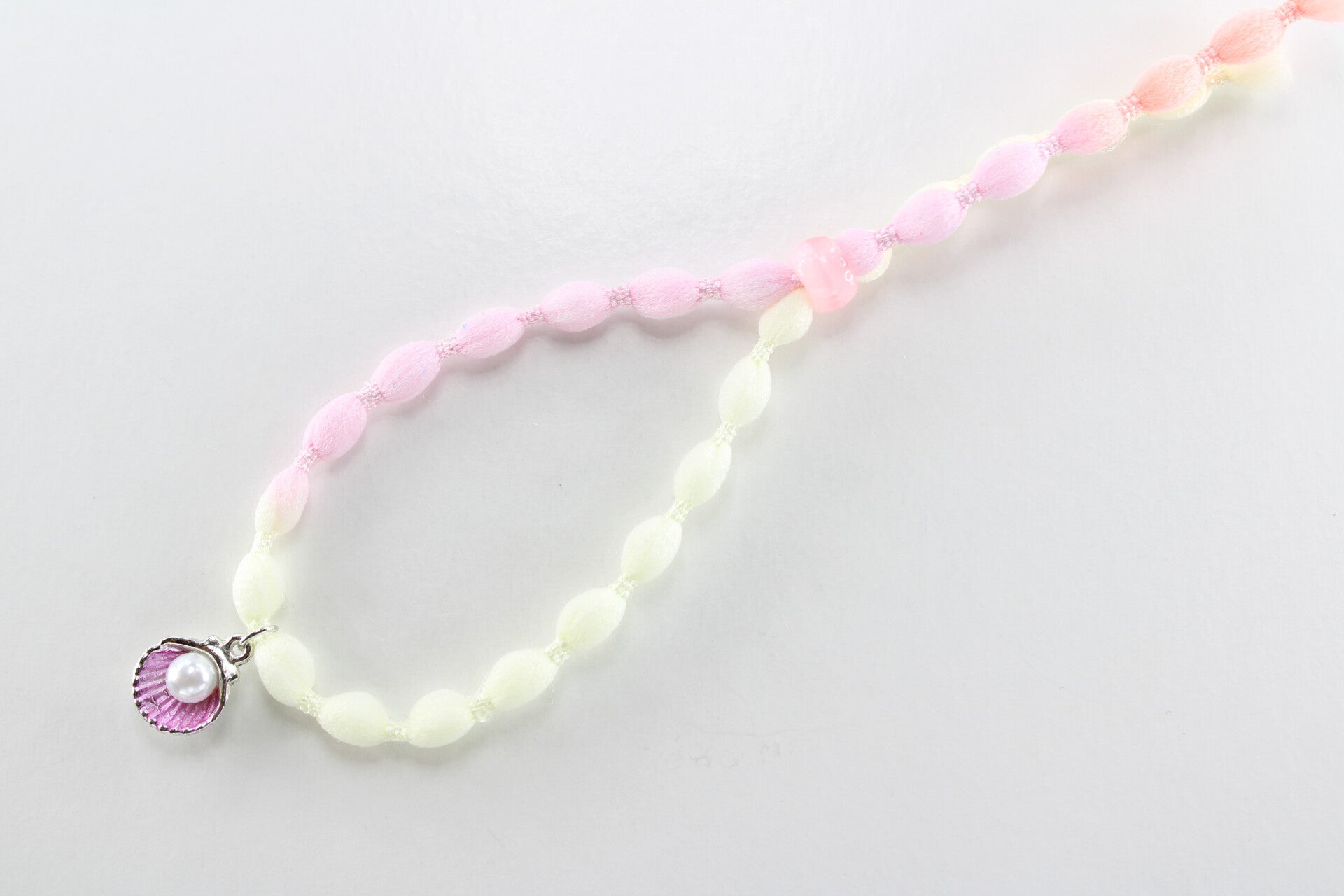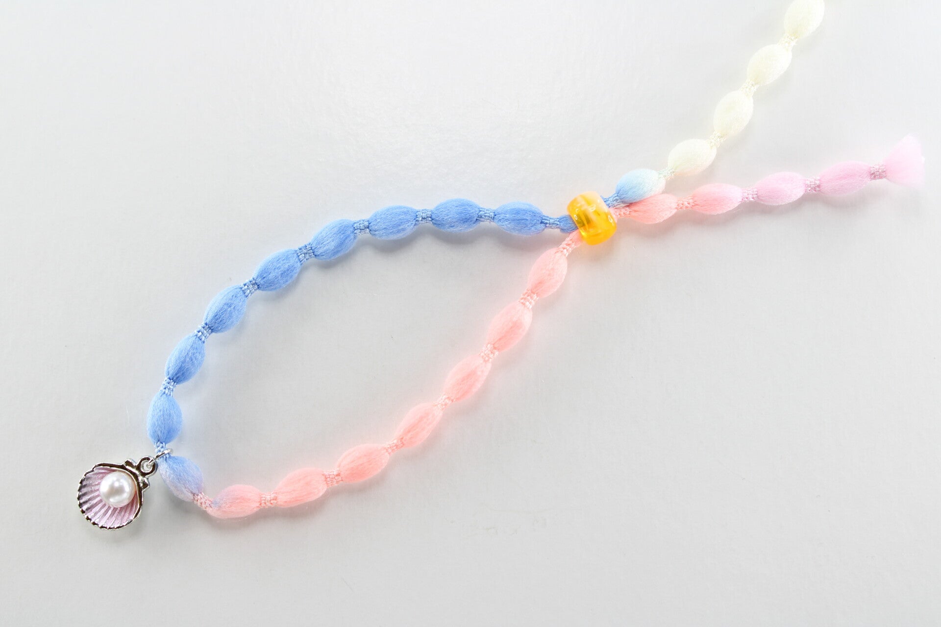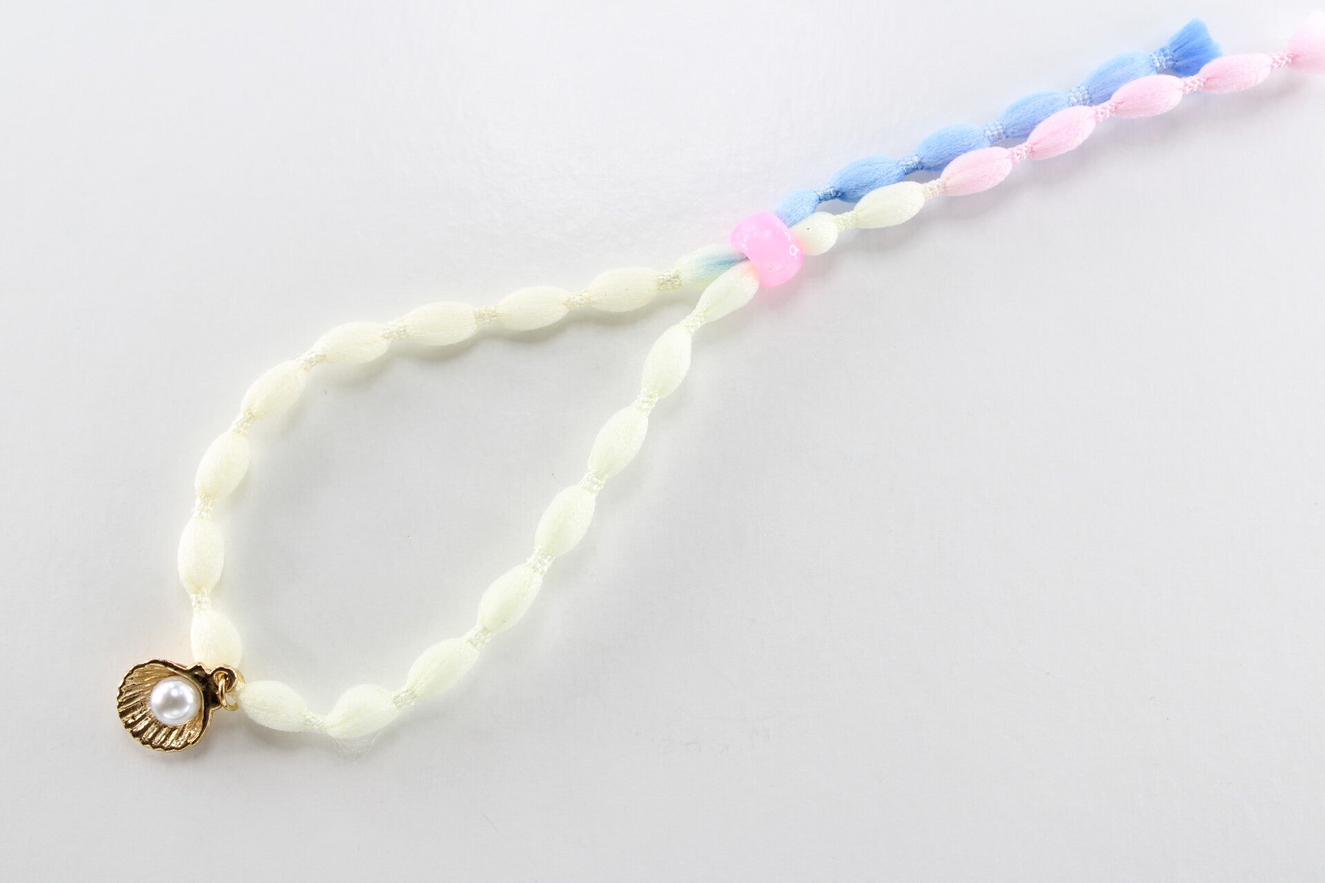 Armband in de stijl van een festivalbandje heeft een mooi zee thema. De armband is kenmerkend door de parelmoer achtige kraal in een schelpbedel.