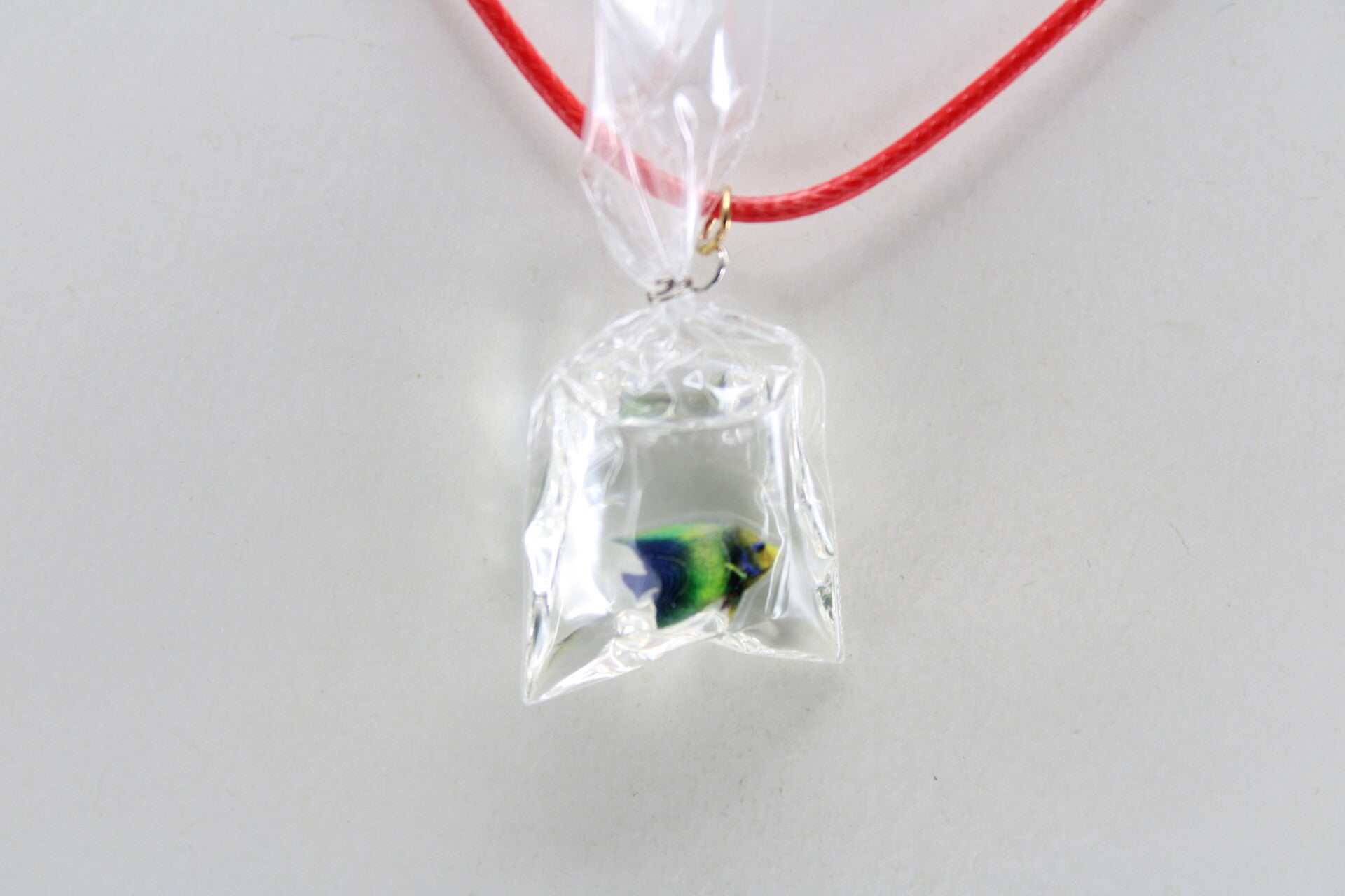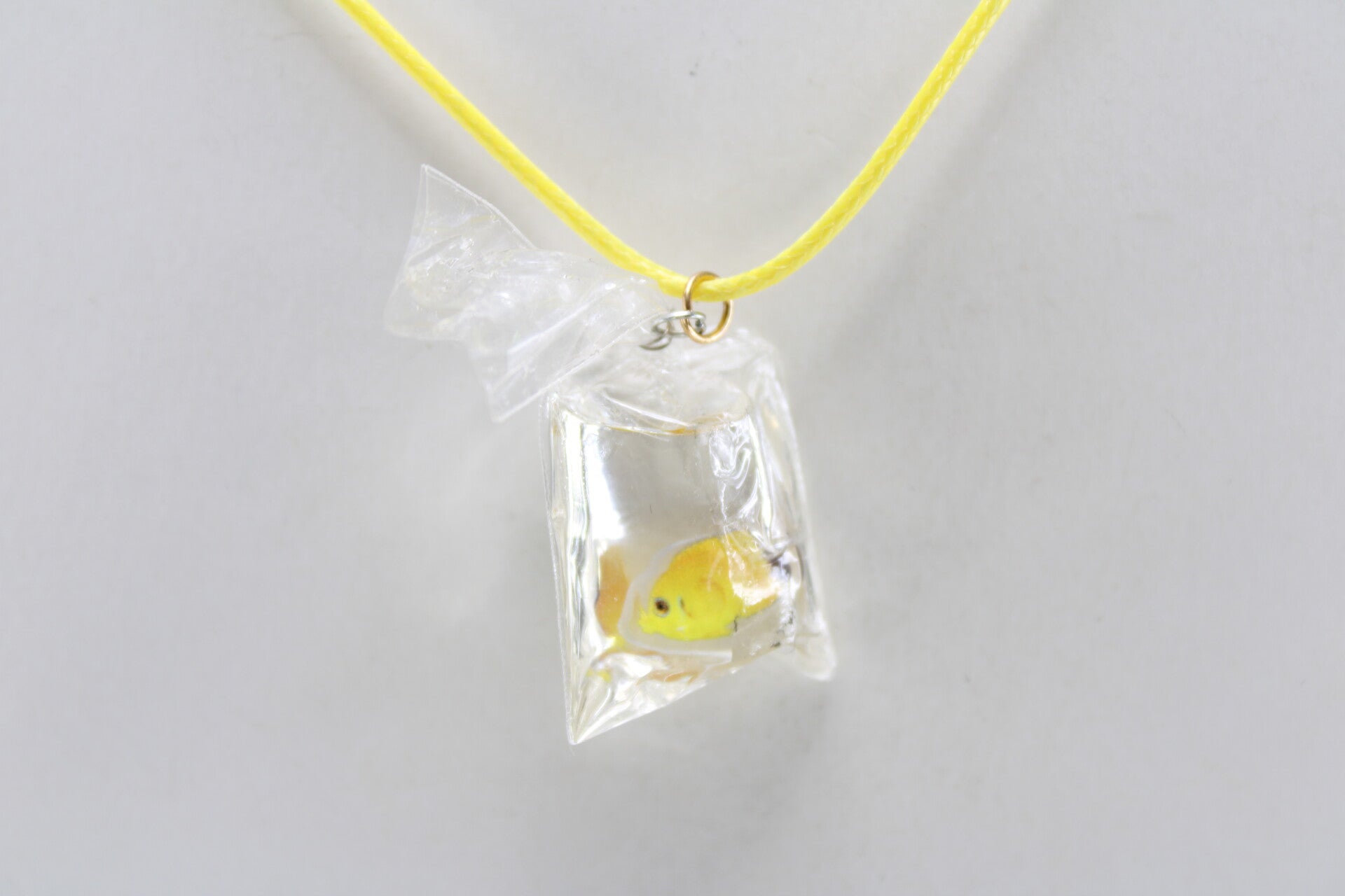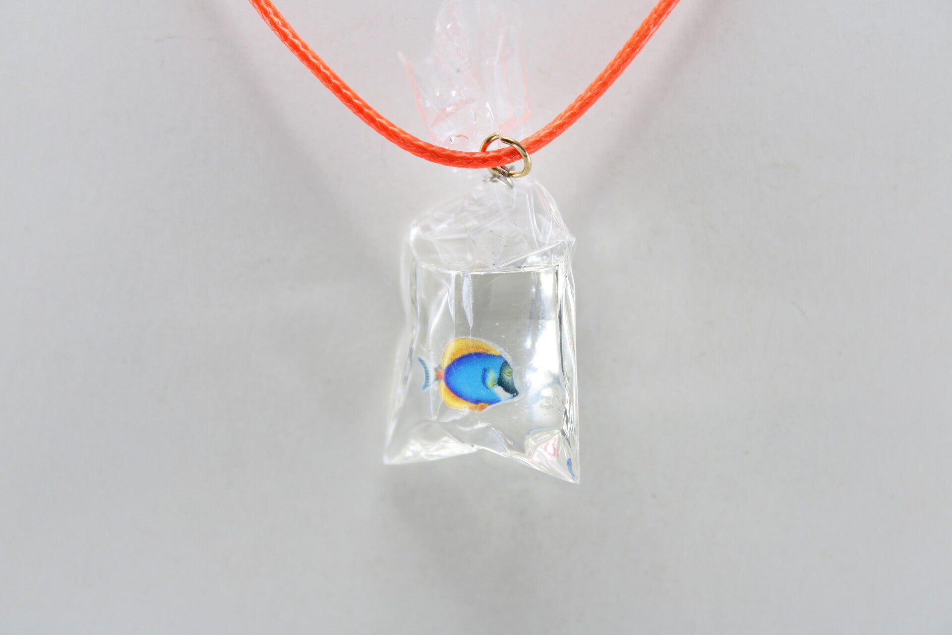 Een vis in een zak water hangend aan een gekleurd koord met sluiting