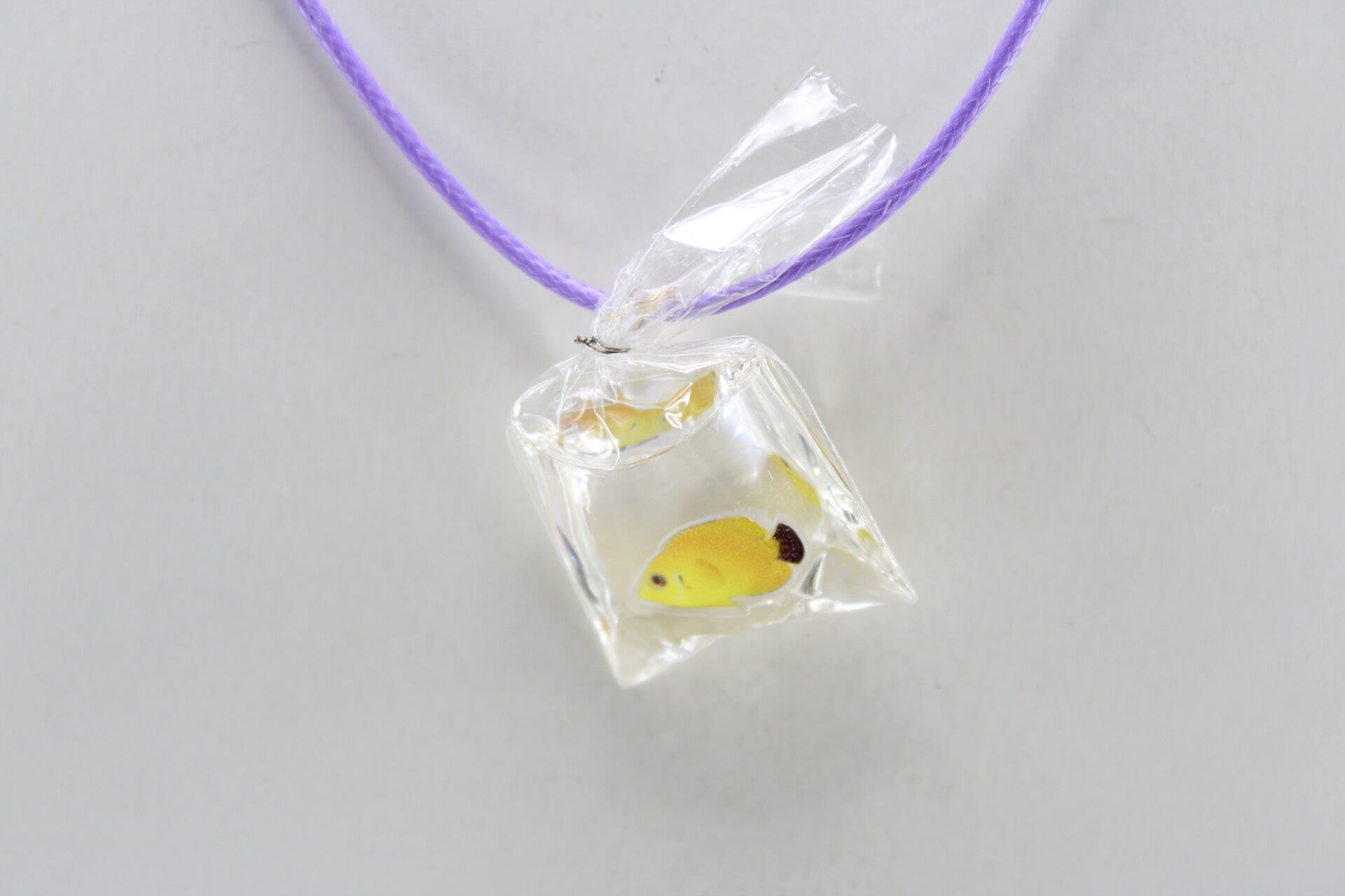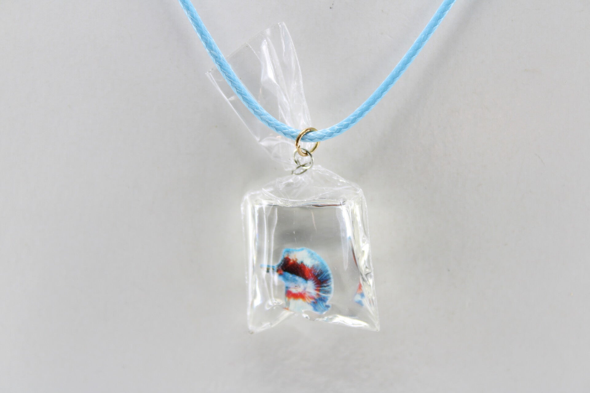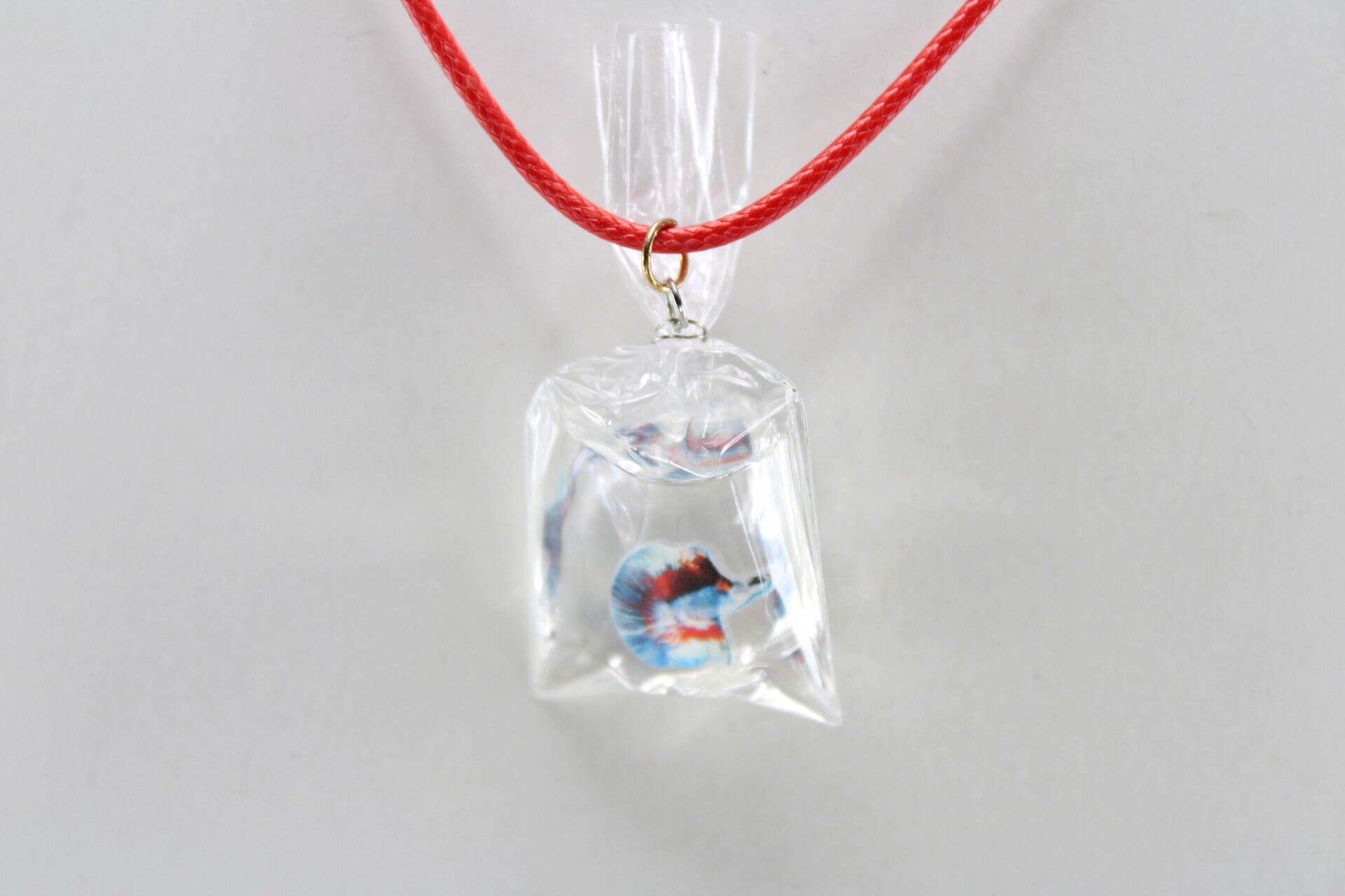Een vis in een zak water hangend aan een gekleurd koord met sluiting