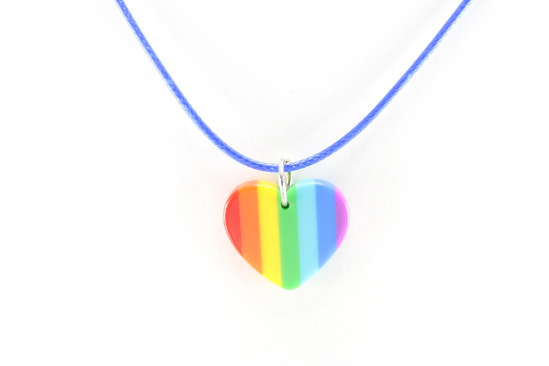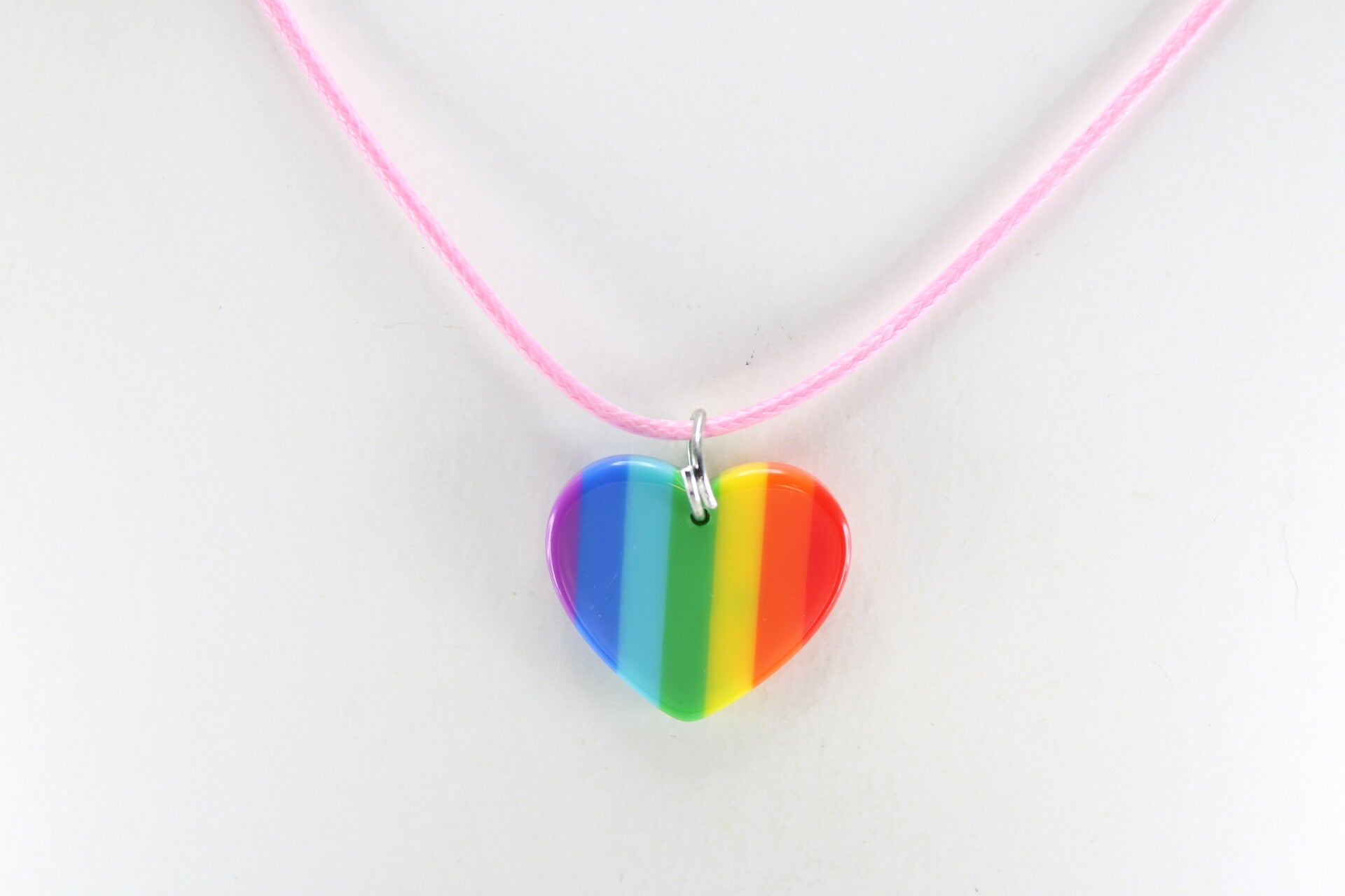 Een kleurrijke hanger in de vorm van een regenbooghart hangend aan een gekleurd koord met sluiting