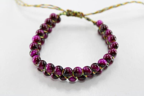 De armband heeft een specifiek geknoopt ontwerp waarbij twee rijen kralen door middel van een koord met elkaar zijn
